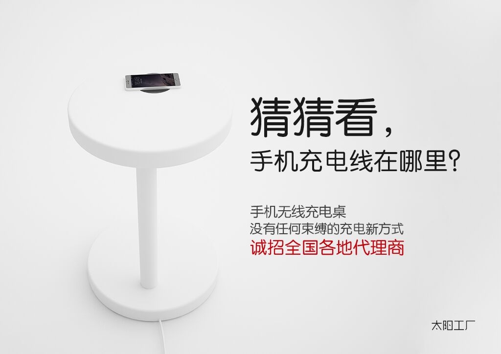 太阳工厂新推出无线充电桌系列产品,采用电磁感应原理,将无线充电套件与桌面结合,让手机充电不需要任何线。