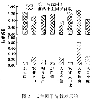 将以上8个表征社会经济对土地利用影响的驱动因素看作一个整体,共同影响耕地的变化。可用因子分析方法,通过它们在新组合成的主因子中的荷载,评价它们在对耕地变化指标的驱动过程中的权重,即相对重要性。结果表明,前4个主因子的解释方差已达总方差的91%,而且任意将8个因素中的几个去除或添加其它因素,8个因素依荷载大小的排序不变。所以,各驱动因素在前4个主因子中的荷载完全可表明其相对重要性。图2为第一主因子荷载和前4个主因子荷载绝对值之和在各驱动因素间的差异。