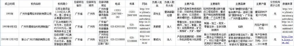 机构信息整理流程 1、 在网站上搜索“机构名称”下的内容,如“联众(广州)不锈钢有限公司”,找到该公司的官网; 2、 在其官网上依次查找筛选出以下相关信息并填写在excel表中:“成立时间”“机构简介”“总部所在城市”“总部详细地址”“电话”“传真”“网址”“负责人姓名”“负责人职务”“主要产品”“主要服务”“主要品牌”“主要产值”“分支机构或子公司信息”; 3、 其中,“主要产品”“主要服务”“主要品牌”“主要产值”可参考3个示例完成填写; 4、 若有分支机构,请将分支机构的名称填写在“分支机构或子公司信息”,若没有,写“无”; 5、 “数据来源”处填写该公司的官网,若无法找到官网则填写找到以上信息的其他网址。