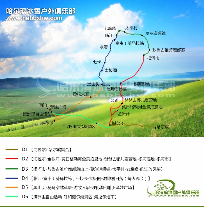 【集合地点】:哈尔滨或海拉尔;直飞海拉尔往返出租车免费报销哈尔滨中转免费代订往返火车票